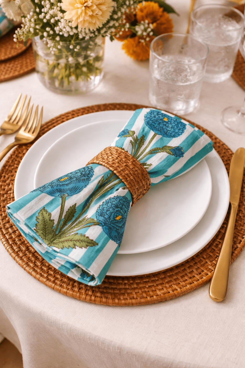 Aqua Stripe Floral Table Napkin