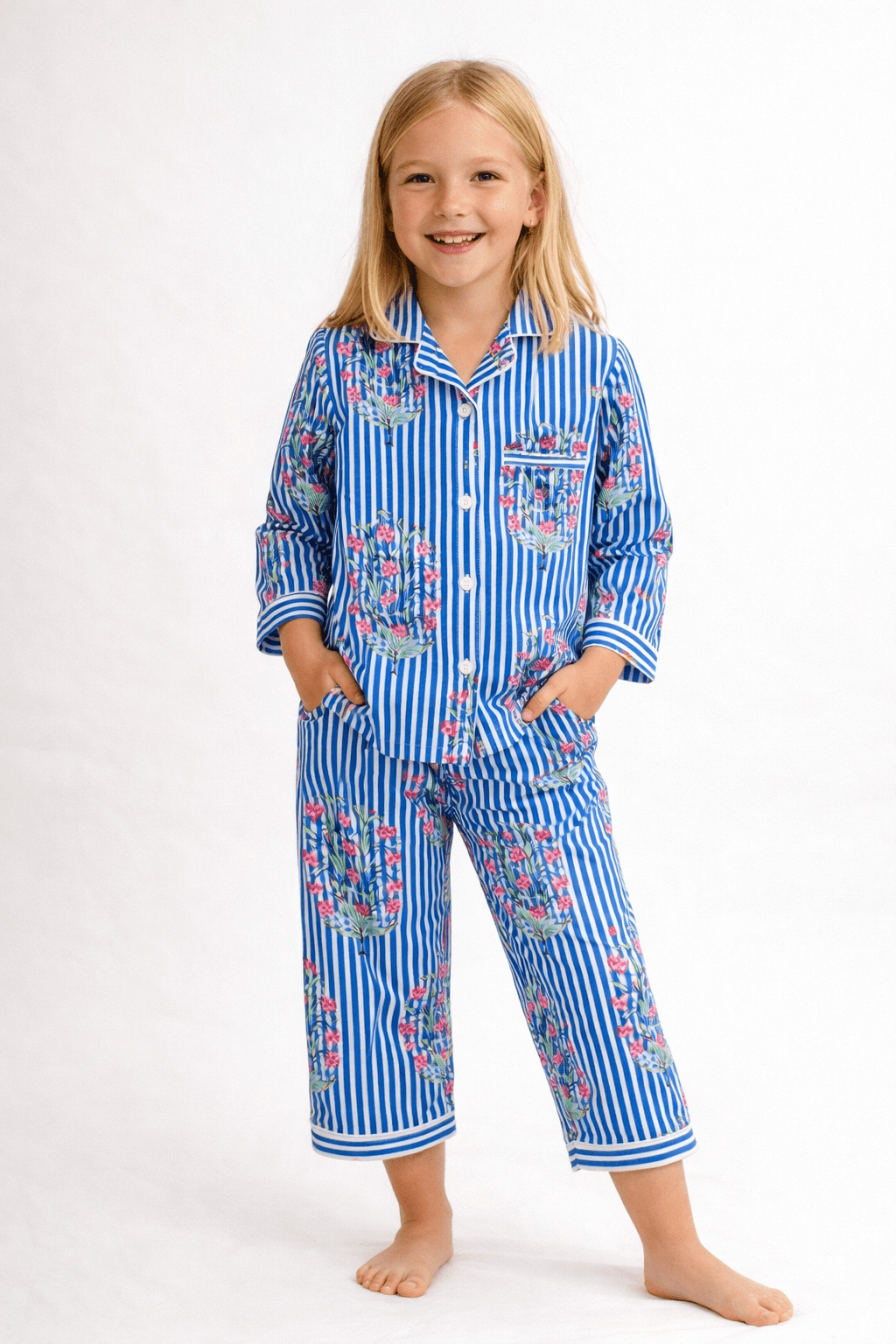 Soft blue stripes paired with delicate floral motifs create a calm, playful look that feels both classic and cheerful. The gentle colour palette and detailed print add a sweet, storybook charm perfect for cosy bedtime moments.