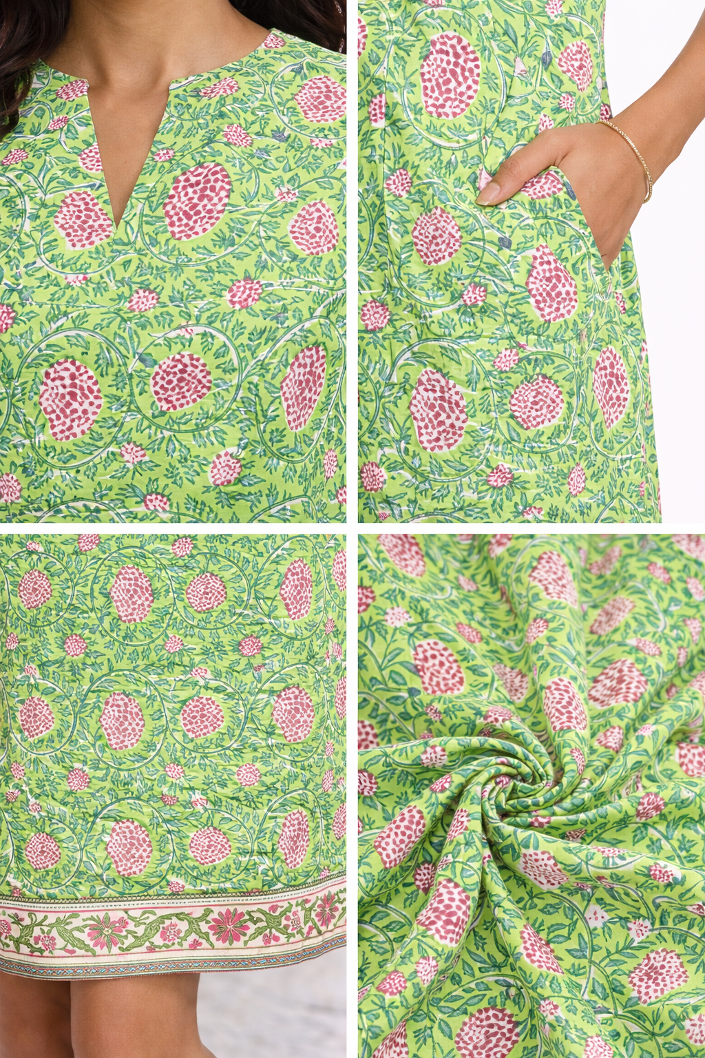 Crafted from soft, 100% cotton, this dress offers breathable comfort for all-day wear. Set on a fresh green base, the print features rose pattern floral motifs intertwined with flowing green vines in a classic repeating layout. A coordinated border adds a refined, finished touch. The sleeveless straight silhouette with a subtle neckline slit creates a clean, flattering shape, while two side pockets add everyday ease—perfect for work, travel, or relaxed weekends.