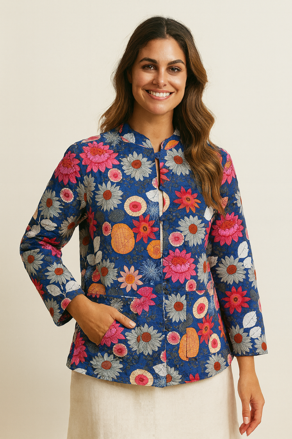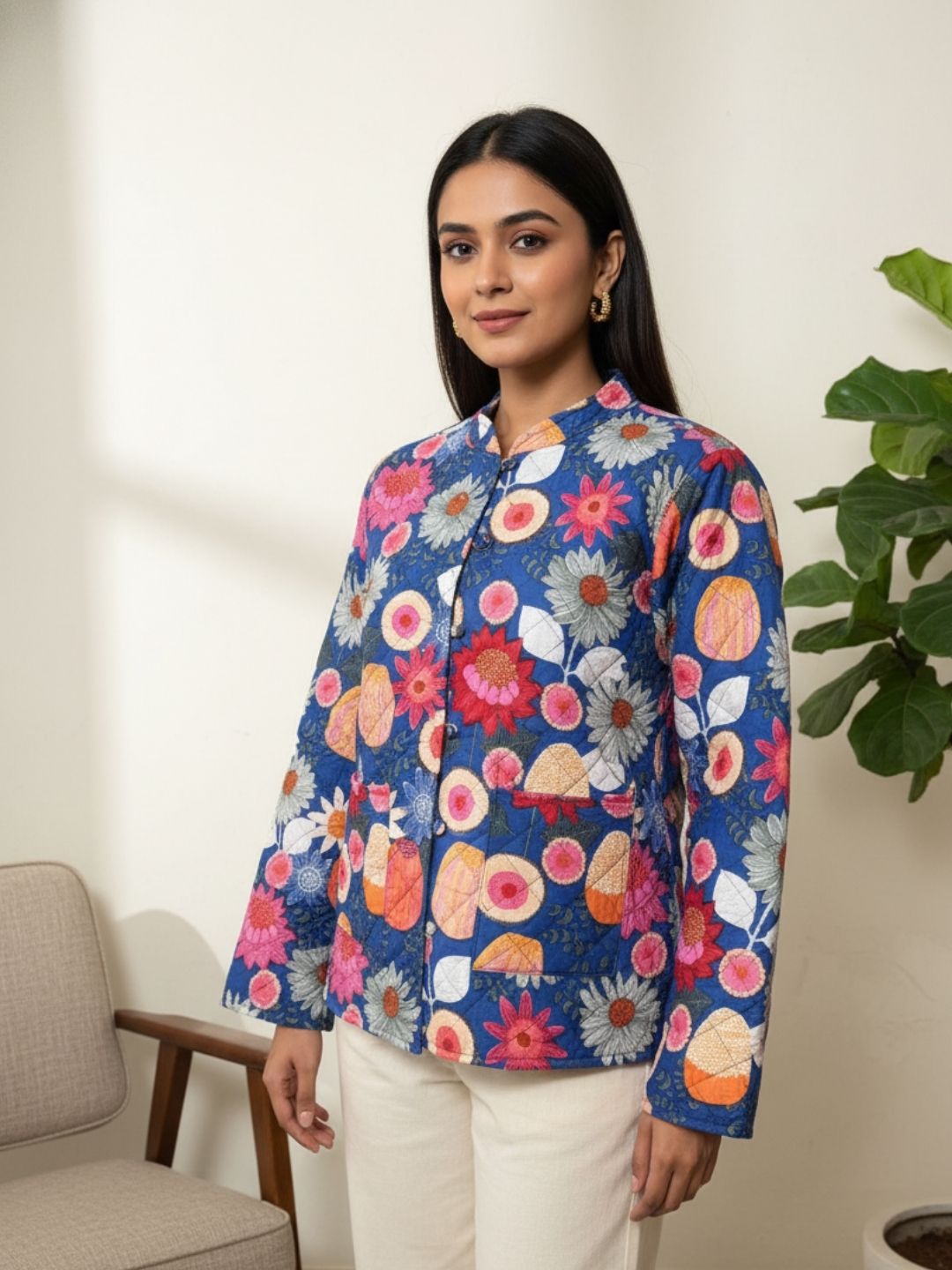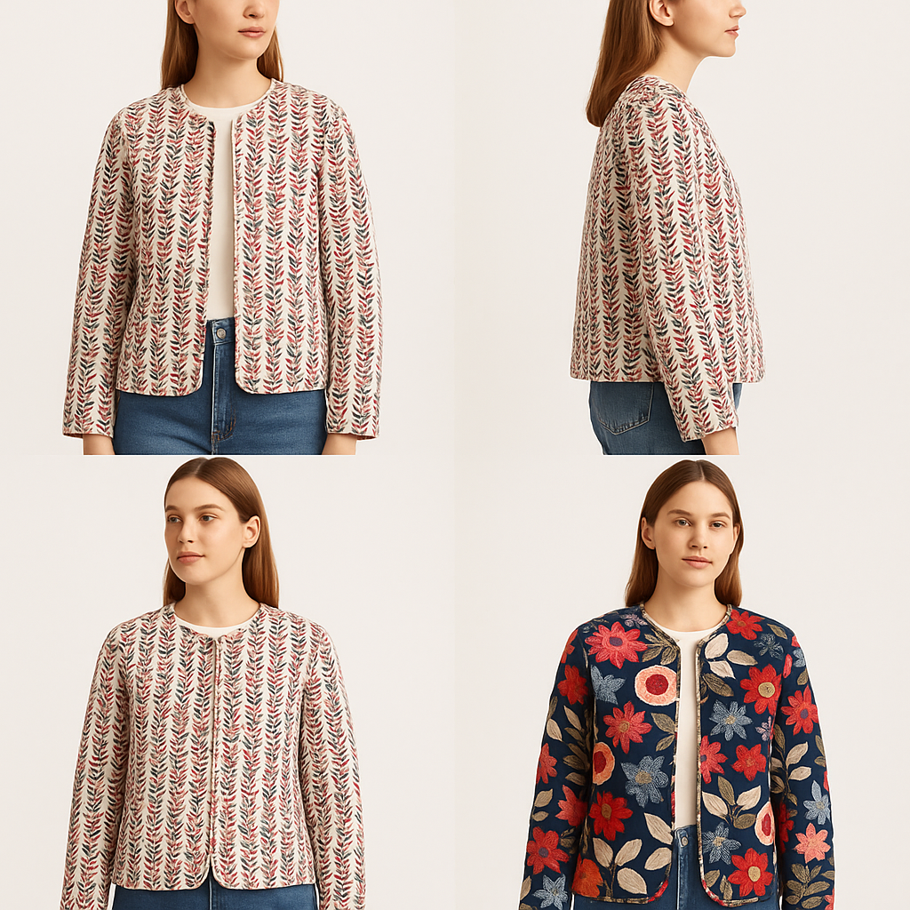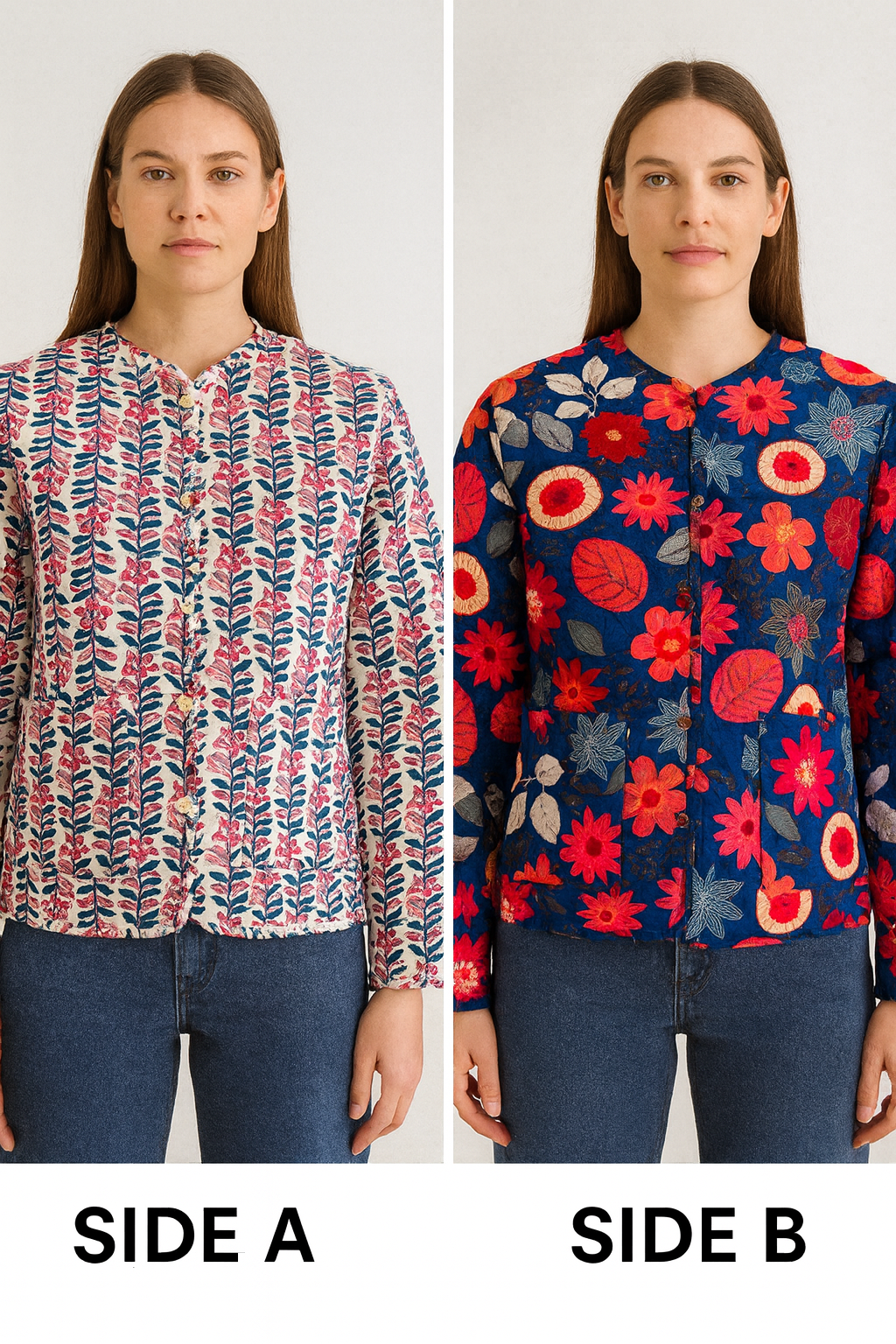 Double the charm, double the style — our Handcrafted Reversible Quilted Jacket – Floral Delight brings you two beautiful looks in one. Featuring a delightful floral design on one side and a complementary, elegant pattern on the reverse, this jacket gives you the freedom to switch your look effortlessly. Lightweight, cozy, and thoughtfully handcrafted, it’s the perfect piece for those who love versatility paired with artistic detail.