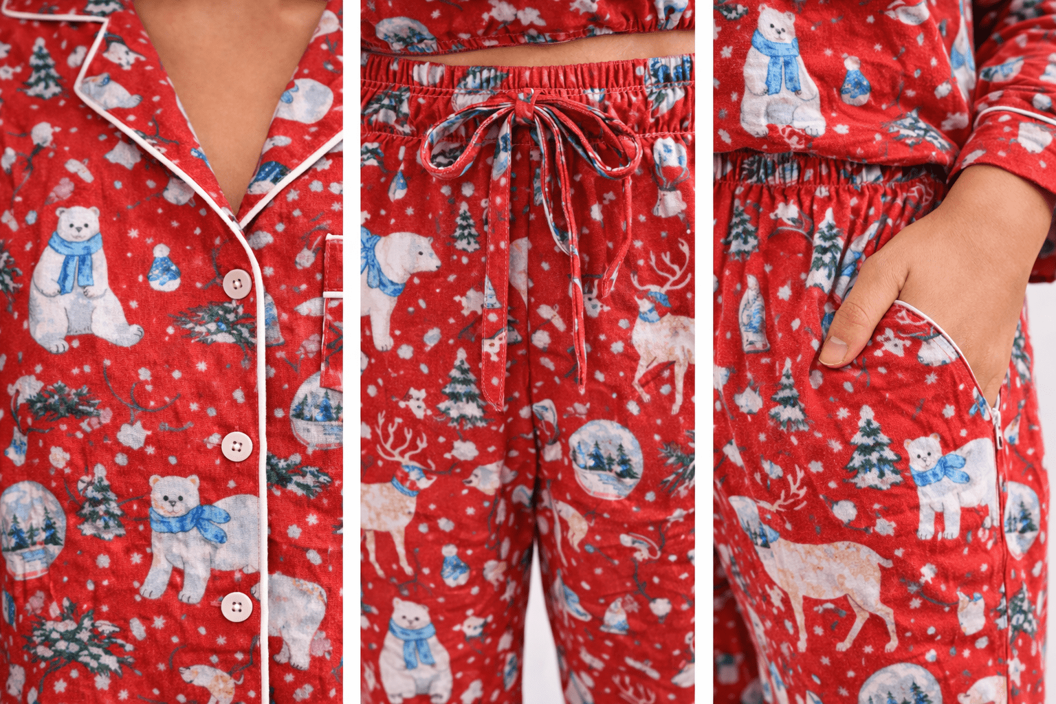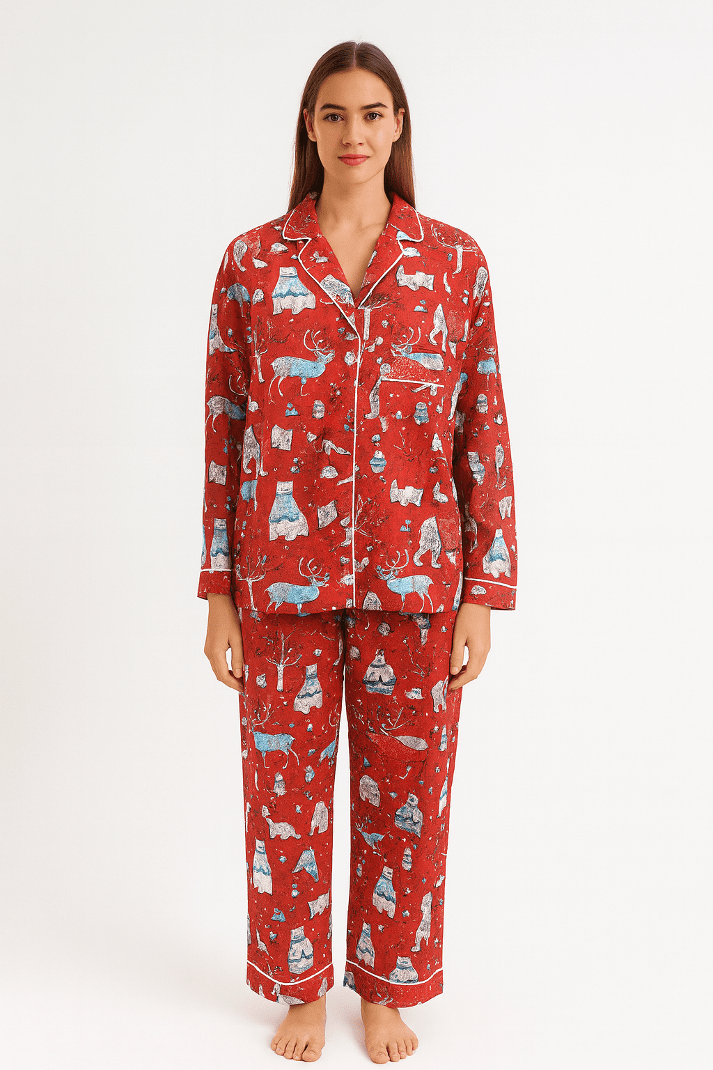 This PJ Set is crafted from soft, breathable cotton in a festive red base with an all-over holiday print featuring polar bears, reindeer, winter trees, and charming seasonal motifs. The classic button-down shirt is detailed with contrast piping and a relaxed fit, while the matching pants feature an elastic waistband with an adjustable drawstring and functional side pockets for everyday ease. Lightweight and comfortable, this set is perfect for cozy evenings, holiday mornings, and relaxing winter nights at home.