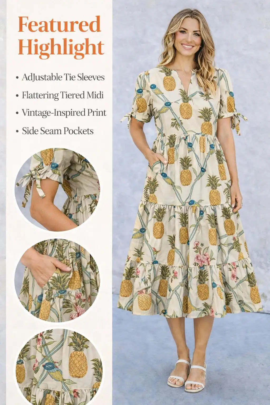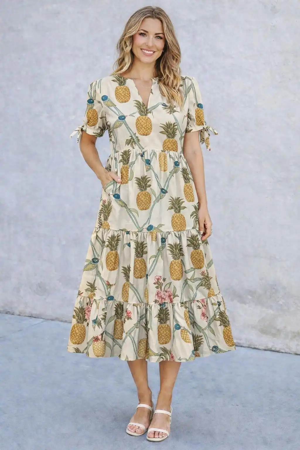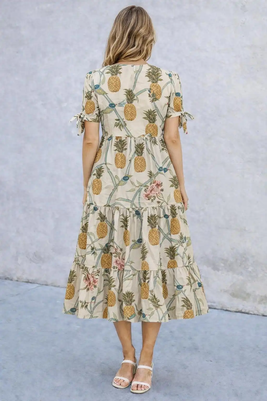 Soft ivory tones form a clean, elegant base, highlighted with playful pineapple motifs and subtle botanical accents. The balanced colour palette and handcrafted print give the dress a fresh, relaxed charm while keeping the look refined and easy to wear.