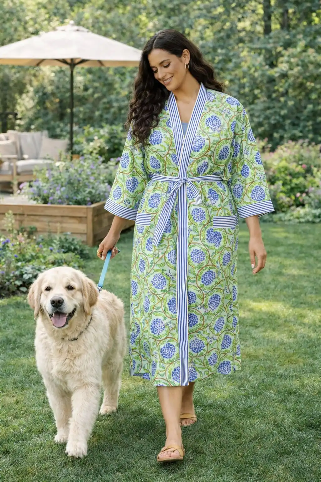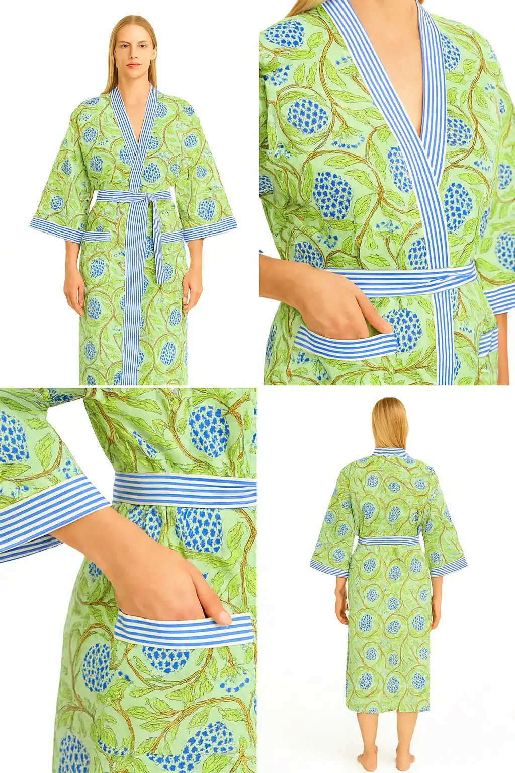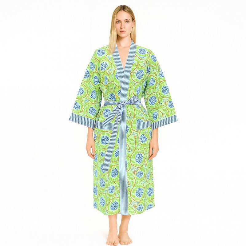Fresh green tones paired with delicate blue floral motifs give this robe a calm, nature-inspired charm. Accented with crisp striped borders, it’s crafted in soft cotton for effortless comfort during morning walks, garden time, or relaxed lounging.