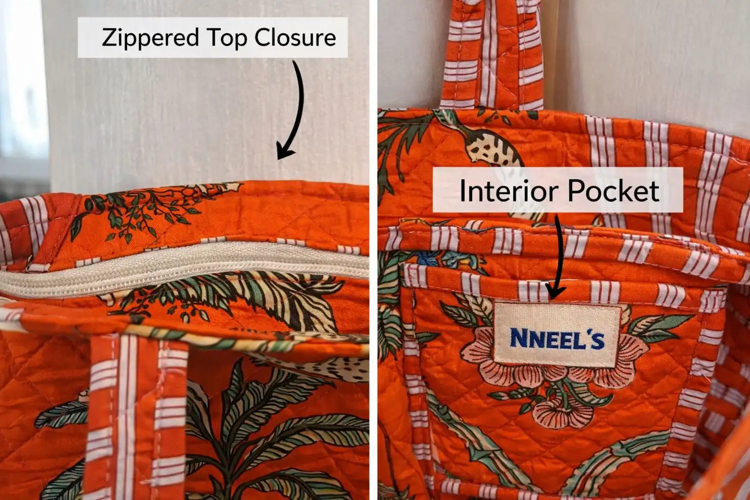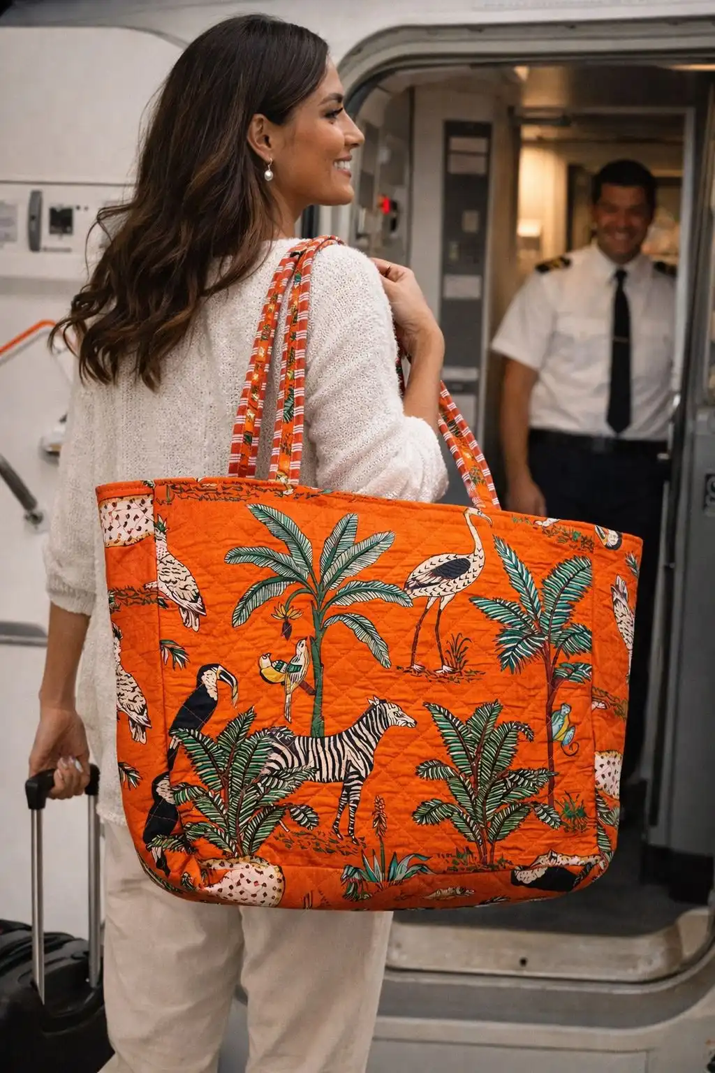 Stand out with our jungle-inspired quilted tote, featuring vibrant wildlife and tropical foliage artwork set against a rich orange background. The quilted cotton construction offers structure while remaining lightweight and comfortable to carry. Spacious enough for daily essentials like laptops, books, or travel items, it is designed with sturdy shoulder straps and a secure top closure for convenience.