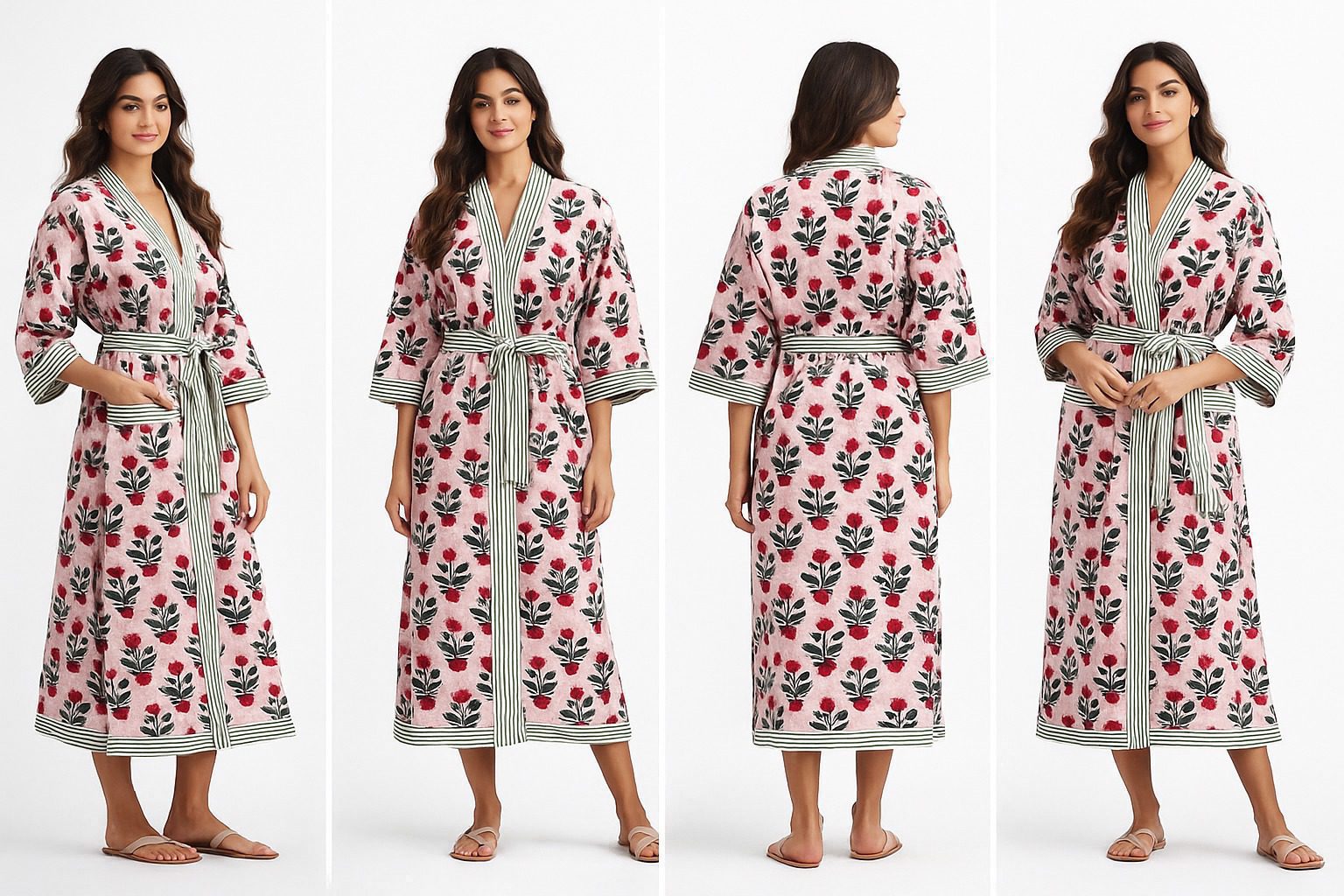 Soft blush tones paired with hand-printed red florals and fresh green accents create a soothing, elegant look. Finished with striped trims and a wrap-around tie, this robe is perfect for slow mornings and relaxed at-home moments.