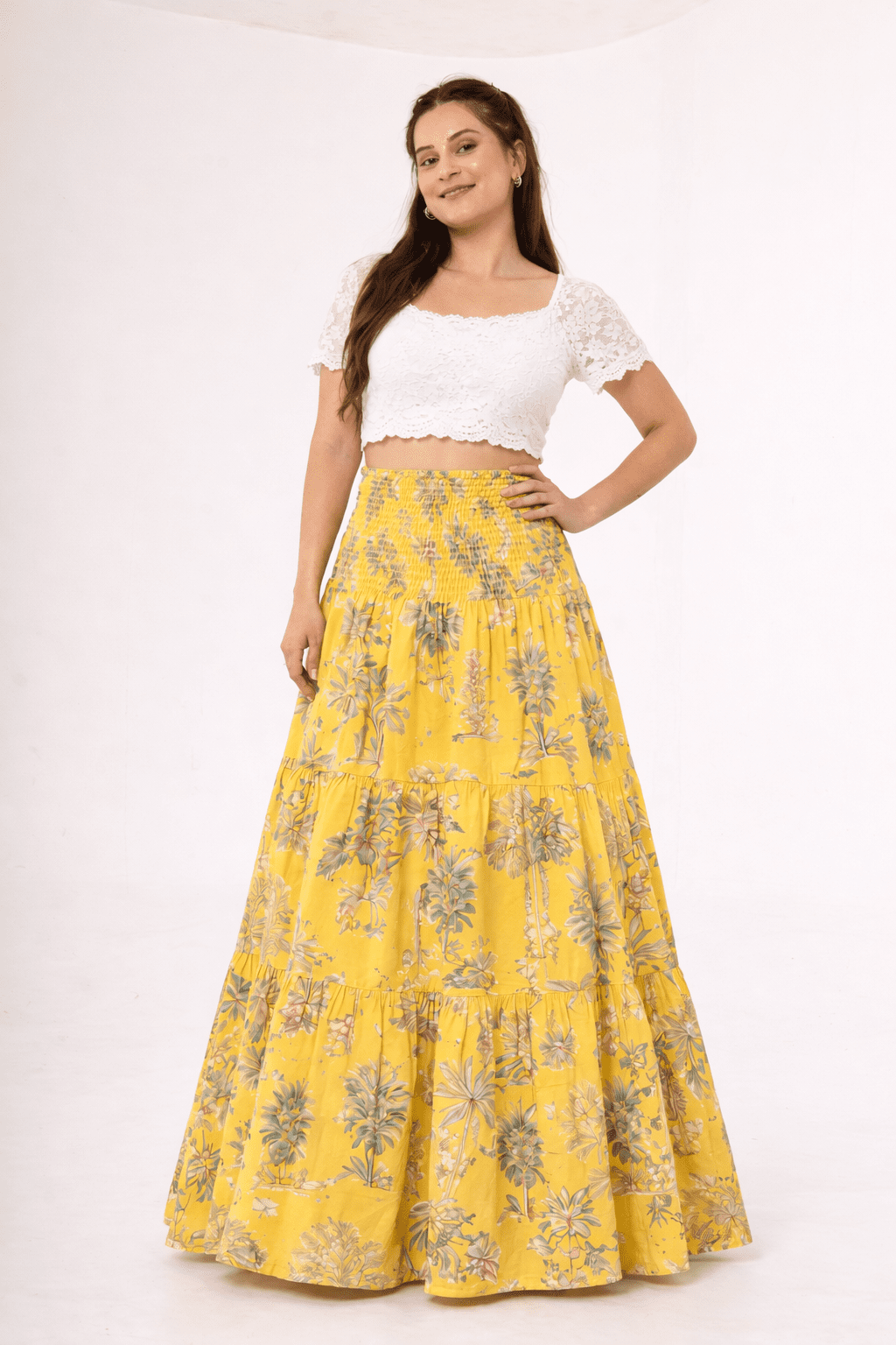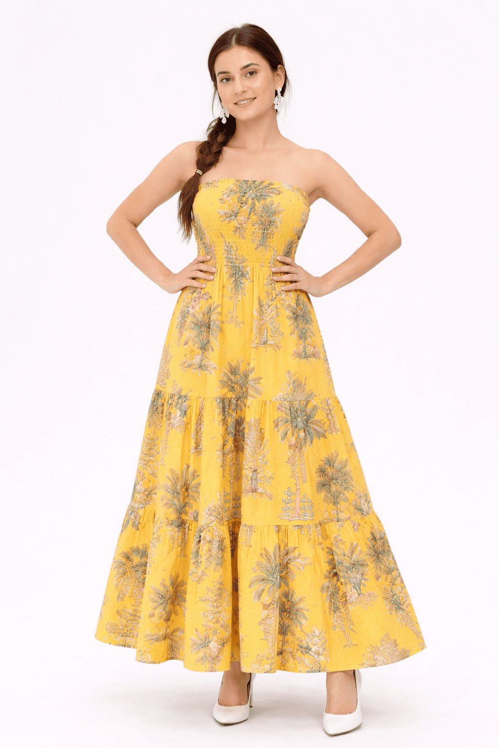 Brighten your wardrobe with our Yellow Palm Strapless Smocked Maxi Dress. Crafted from soft, breathable cotton on a vibrant yellow base with tropical palm prints, it offers a flattering smocked fit with a secure elastic grip neckline for all-day comfort. Wear it as a dress or style it as a skirt, a versatile, vacation-ready piece designed for everyday style.